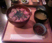 今日のランチは B♭よりにある「あおば」に来ました。 あれ、まわりで食べている美味しそうな今日ランチ=エビフライ、コロッケ…が品切れですって…^^; 今日はステーキ丼にしました。いただきま〜す K